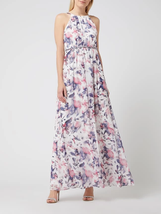 Das Abendkleid von Jake*s Cocktail ist aus leichtem Material gefertigt und tailliert geschnitten. Es kommt mit floralem Muster, ausgestelltem Rockteil und feinen Raffungen.