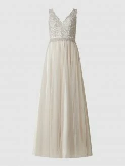 Das Abendkleid von Mascara ist aus Tüll Material gefertigt und tailliert geschnitten. Es kommt mit floralen Stickereien, Strassteinen und mehrlagigem Rockteil.